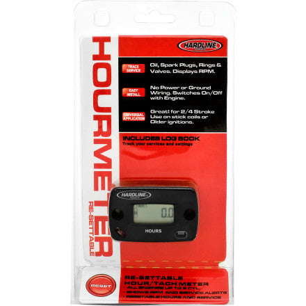 Hardline Products Surface Mounted Inductive Meters provide what today's power-sports user needs and expects from hour meters. Late model four stroke engines have strict maintenance schedules that must be followed to honor your warranty. the Hardline Re-Settable Meter addresses all your maintenance needs, oil, valves and air filter. New, for 2012, Hardline has added a Tachometer function for reading your RPM. Knowing your RPM readings are important for passing sound checks and setting idle speed. Also new for 2012, every hour meter from Hardline Products now includes a Log book for quick referencing of your written service notes. Write down oil changes, valve service, chassis lubrication, clutch service and suspension setting notes in one convenient book.